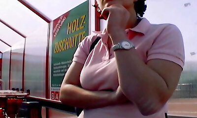 A super big-chested German brunette gets her muff hammered outdoors